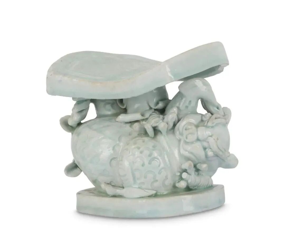 此影青双狮枕采用复杂的堆塑技法,上部枕面为如意形,上刻水波纹。中部雕塑两只嬉戏的卧狮,两狮首尾相接,憨态可掬,其中一只狮子紧紧的抓住另一只狮子的尾巴,好似胜券在握的表情刻画的十分生动,另一只狮子似要奋力翻转身体跃跃欲试,两只狮子的身上的卷毛等细节运用浮雕的方式装饰十分形象。下部为腰圆形,枕底胎厚重无釉。整体施青白釉,釉色匀净。