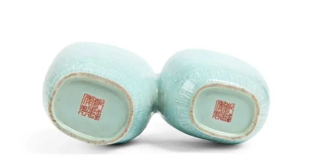 此瓶造型独特,分别由五只相同尺寸、形制的瓶子环绕著中央的主瓶,共同构成一件独立完整的六联瓶。整器俯视宛若梅花绽放,中央高瓶恰似花蕊高起,周围五瓶类梅瓣相拥似花瓣。内腹相通,造型新颖,于典雅氛围中巧现其思。通体施粉青釉,釉面均匀凝润,中间瓶底足有青花「乾隆年制」四字篆书款。雍乾之际,御窑厂摹古创新,极力烧造玲珑转心瓶、六孔花插和七孔花插等同时融合烧造技术与想象为一体的新瓶式。而六孔瓶更多见于乾隆官窑制器。