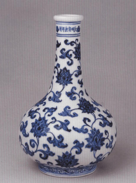 青花缠枝莲纹瓶,直口,圆唇,细长颈,扁腹,圈足;通体青花纹饰;口沿下饰朵梅纹,身部饰缠枝花卉,足墙外饰卷枝纹。此器造型朴实,青花明艳,瓶口沿下横书款者较为少见,是明宣德青花瓷器之佳作。