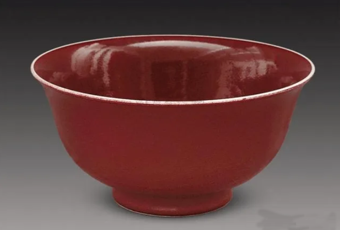 宣德朝是明代红釉器制作最辉煌的时期。这一时期,红釉制品不仅在数量上有明显的增加,而且较之永乐鲜红釉器更胜一筹,出现了宝石红、祭红、积红、霁红、鸡血红、牛血红等新品种。宣德红釉呈色浓艳,又往往在器物转折变化的棱角处隐现胎骨而呈现白色筋脉,增添了视觉的变化,耐人寻味。