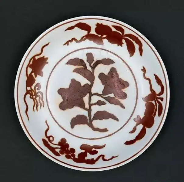 这一时期烧制的盘、碗底足多数有棱边感,非滚圆之“泥鳅背”。宣德大盘底足内墙自上而下向外斜削,圈足常见火石红。