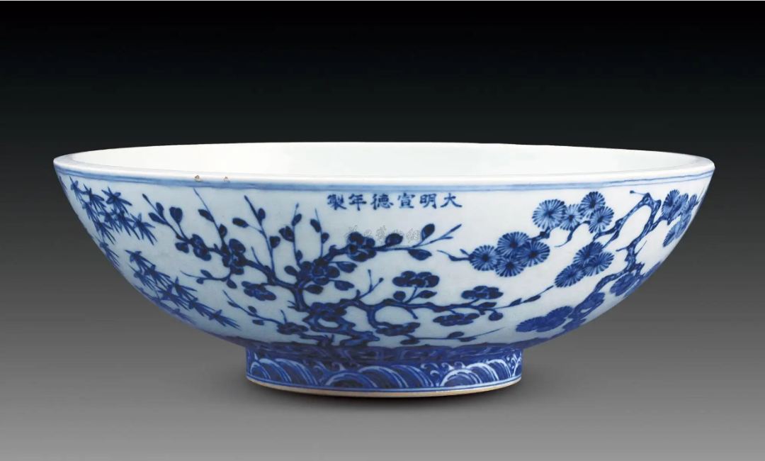 宣德青花瓷器造型敦厚端庄,釉面青亮,纹饰细腻豪放,笔法潇洒,一向被列为明代青花之冠。此盘主题纹饰为松竹梅纹,松竹梅世称“岁寒三友” ,寓意高风亮节。