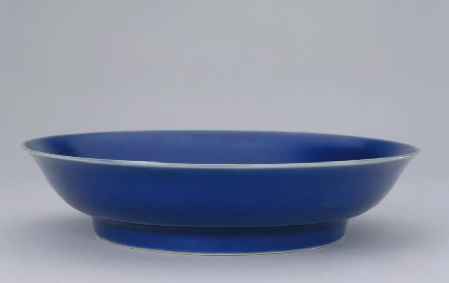 祭蓝釉暗花云龙纹盘,撇口,弧壁,圈足;通体施高温钴蓝釉,口沿处因高温下釉层熔融垂流映现白色骨胎,形成一道圆润的白边。盘釉面泛橘皮纹;内壁暗印双云龙戏珠纹,因釉层厚,纹饰不清晰;足内施白釉,中央青花双圈内“大明宣德年制”六字双行楷书款。此盘造型规整,釉色纯正,是宣德朝祭蓝釉瓷的典型器。