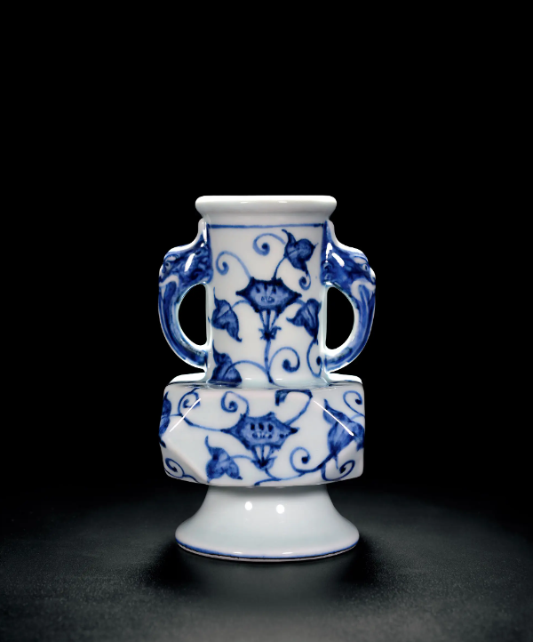 青花牵牛花纹四方倭角瓶,造型系模仿西亚伊斯兰国家金属器。瓶腹委角处过度自然,器足内呈台阶式,这种将外撇形高圈足的内部作成台阶式成为宣德时期的一个特征。