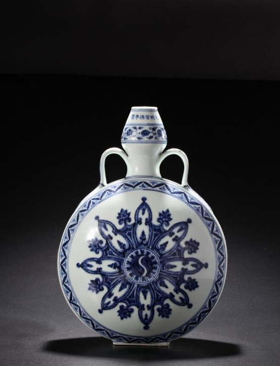 青花阿拉伯花纹绶带耳葫芦扁壶,呈葫芦形,口、颈部为圆形,腹部为竖向扁圆形,下承以方圈足;颈、肩之间对称置绶带形耳;通体青花纹饰。壶口部绘缠枝菊花纹,腹两面均绘阿拉伯花纹,耳上绘折枝花纹;口沿下自右向左署青花楷体“大明宣德年制”横行款。此葫芦扁壶为明永乐时景德镇御窑厂的创新器形,宣德朝继续烧造,品种有白釉、青花等,造型与纹饰皆仿自西亚伊斯兰工艺品。
