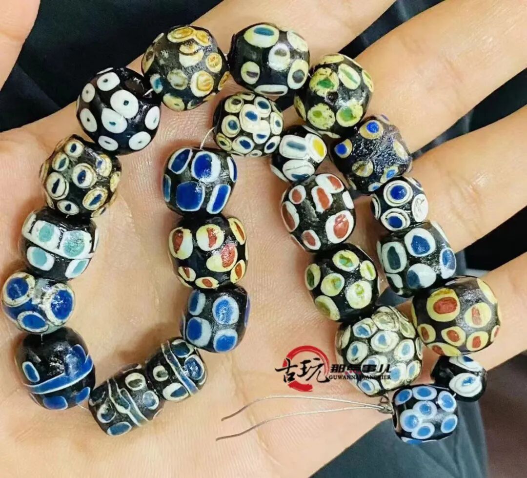 古代中国对琉璃珠的称谓有很多种,包括缪琳、琅轩、陆琳、琉琳、玻黎、硝子、罐子玉、罐玉、药玉等等。而在日常区分中,我们时常将不透明的玻璃珠子称为“料珠”;把半透明的玻璃珠子称为“琉璃珠”;把全透明的玻璃珠子称为“玻璃珠”的区分方法很不准确。在中国的汉文化中,珊瑚材质的珠子并没有太多使用过的记载,大多数的珊瑚珠子源于草原文化。![]()