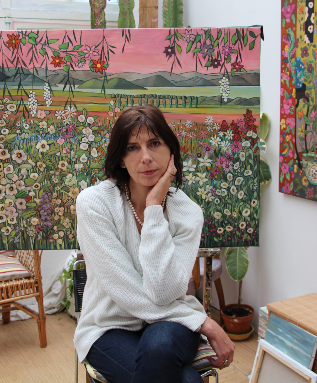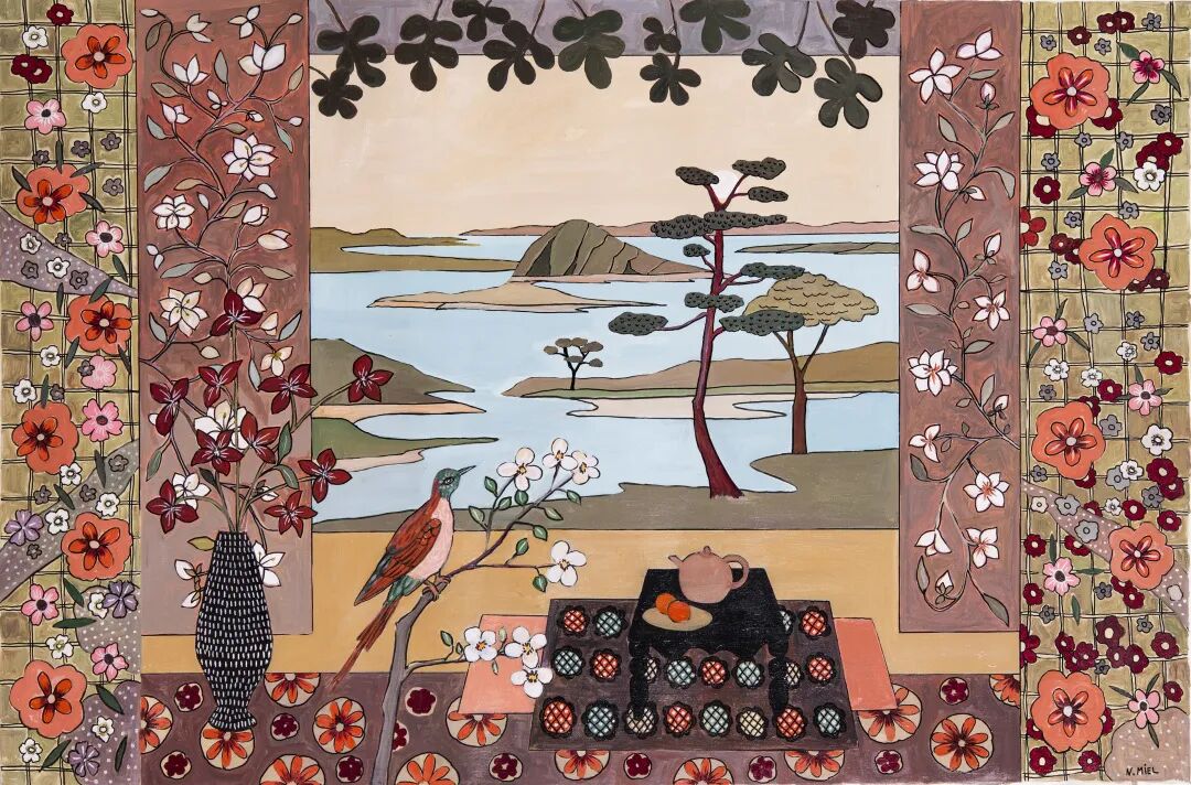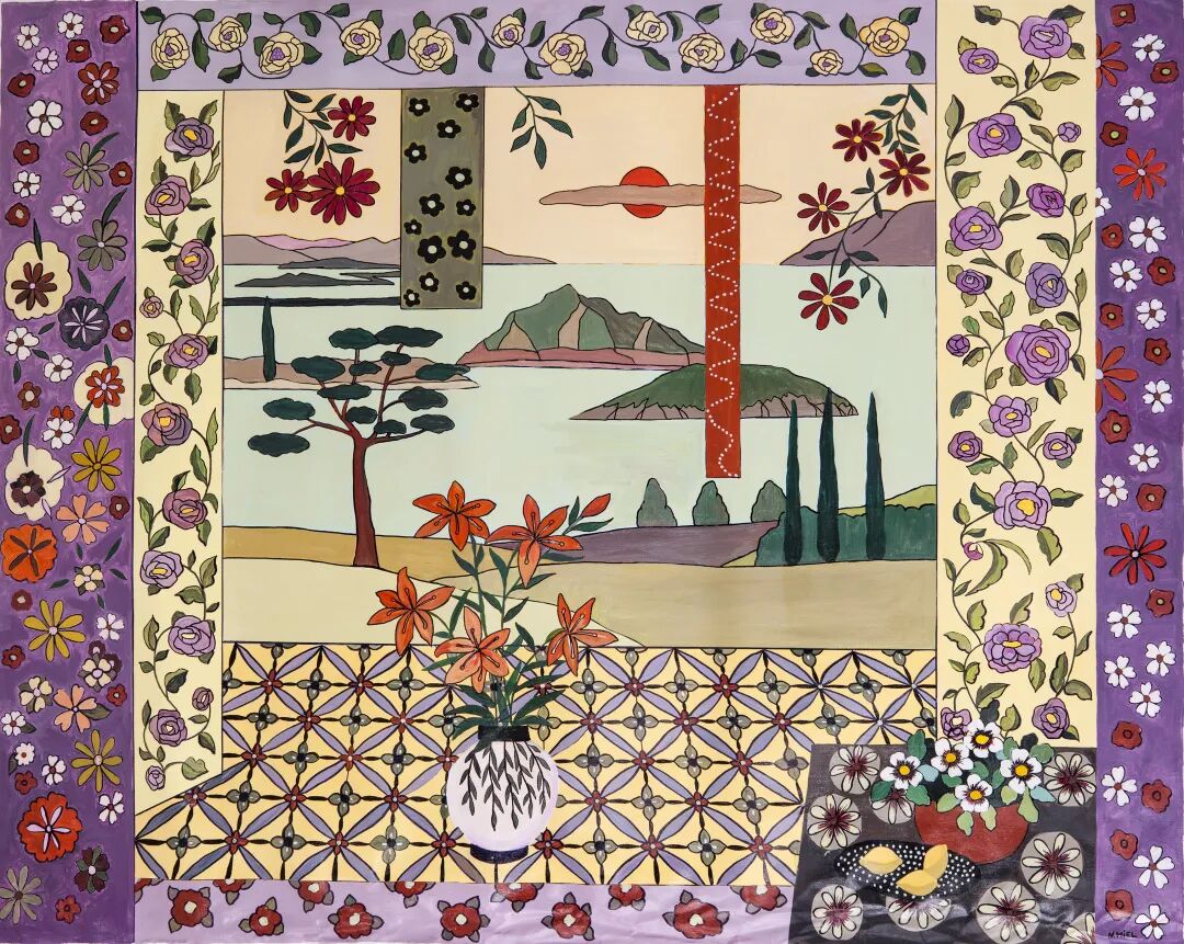在用色彩延展视觉这一点上,马斯蒙泰的地平线创作融合了他对风景与故事的理解,提供了一种别样的想象纬度。乔尔达笔下的静物瓶花则拥有古典主义的诗意情调,并通过光影将色彩烘托而出,在有限的框架中绽放无穷的生命力。另一边,米耶尔以极具装饰性的图案与色块,为我们打开了一扇又一扇窗户,展现原始主义所蕴含的天真烂漫,以及精心巧思的符号语言。