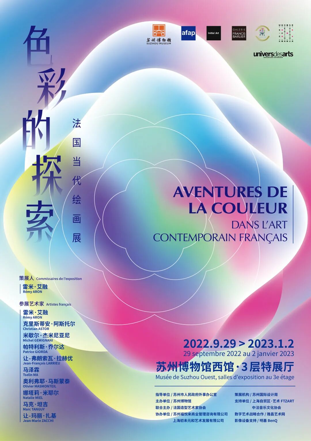 最后,诚挚感谢法国造型艺术家协会联合发起本展。在西馆开馆一周年之际,由苏州博物馆主办、苏州国际设计周策划的“色彩的探索——法国当代绘画展”,将成为2022年中法文化交流的重要桥梁,更是苏州博物馆与法国艺术界长期友好往来的美好见证及延续。