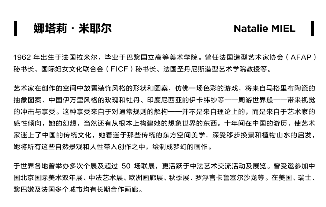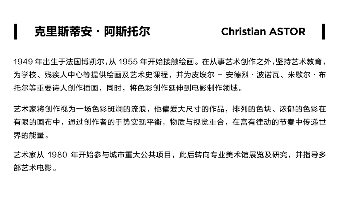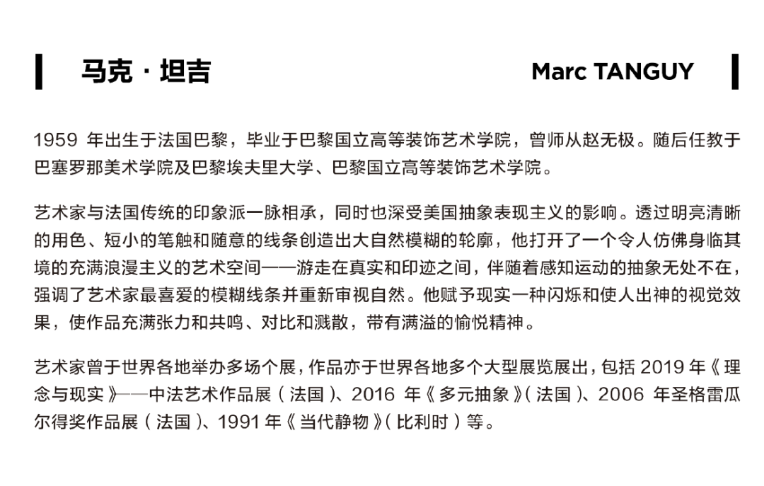 此外,展览呈现了立体与抽象主义的创作,运用不一样的笔触、线条来诠释空间、物体和主题。无论何种角度与方式,10位法国当代艺术家的118件作品对色彩的探索都令人无比期待,尤其在新冠疫情仍然存在于世界各国的当下,必定会带来自艺术而生的力量与希望!