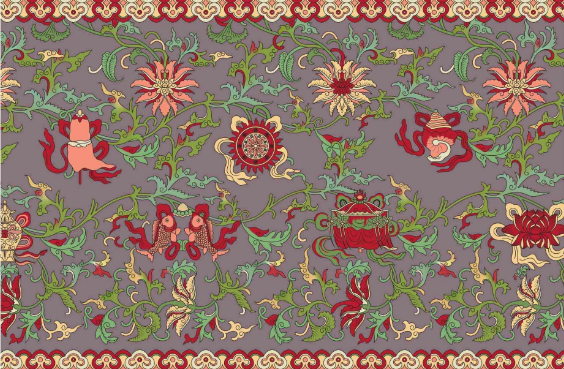 吉祥八宝,藏语“扎西达杰”,又称八瑞相、佛教八宝,由象征佛教威力的八种物象——宝伞、金鱼、妙莲、宝瓶、右旋白螺、吉祥结、胜利幢、金轮组成,多以壁画、金银铜雕、木雕刻或唐卡的形式出现,也有少量的塑雕八吉祥物,是一种具有典型佛教哲理的绘画艺术,也是佛教文化中最著名的一组符号。据相关书籍记载,在佛教传统中,象征好运的八吉祥物代表释迦牟尼得道时伟大吠陀教众神敬献他的供物。传承至今,吉祥八宝依旧是代表祥瑞的图腾。