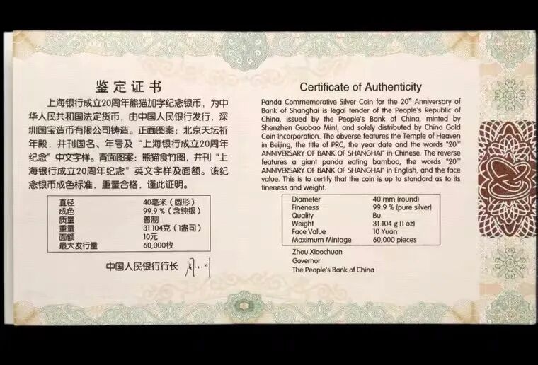 上海银行加字猫是在15版熊猫币上进行加工镌刻的,而2015版熊猫币是首枚也是唯一一枚没有在币面标注计量单位的熊猫币。![]()
