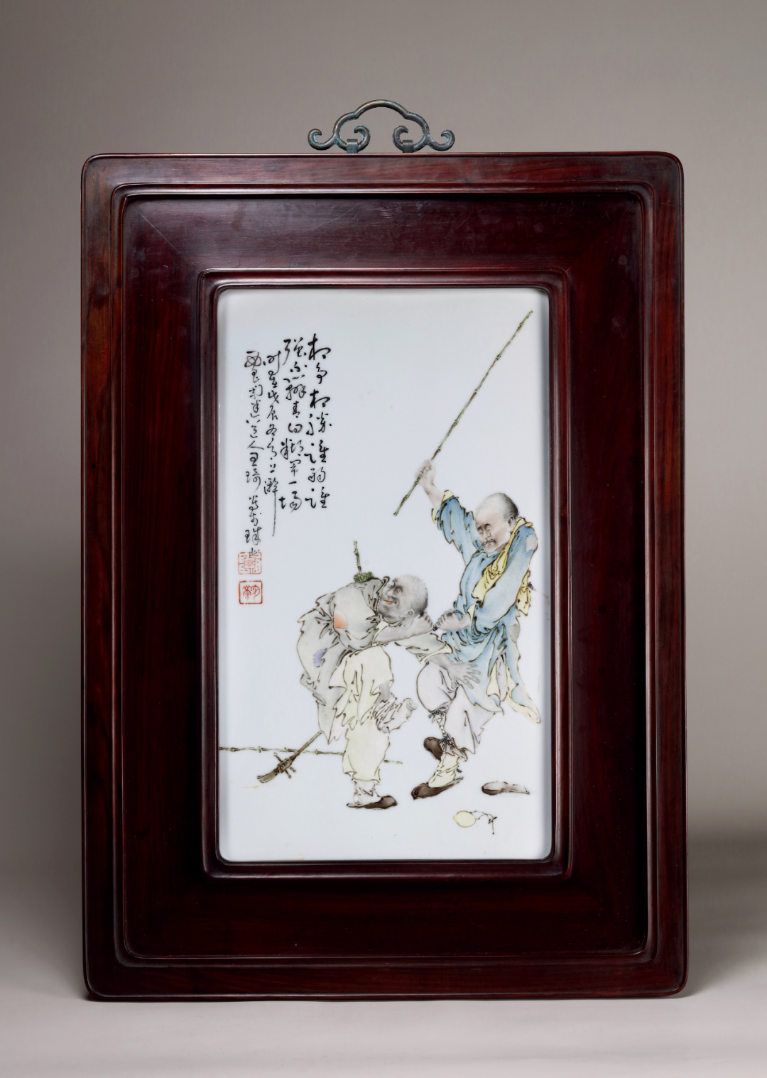 民国 王琦 粉彩瞎子打架瓷板