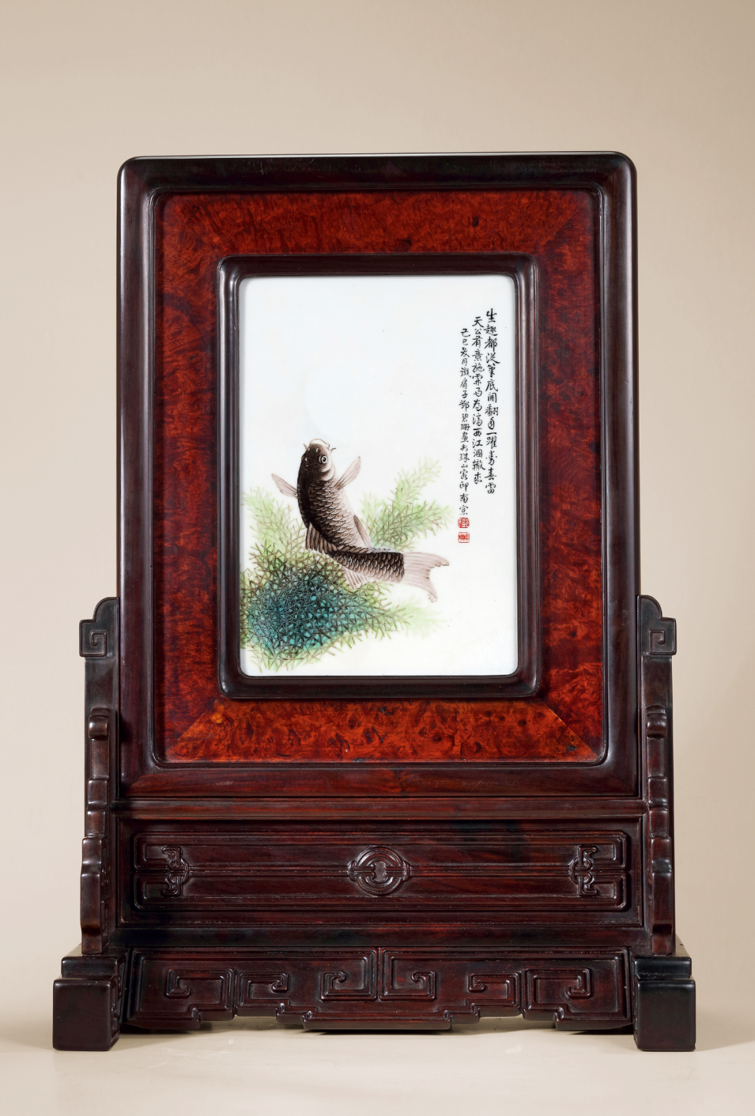 民国 邓碧珊 粉彩鱼跃龙门插屏