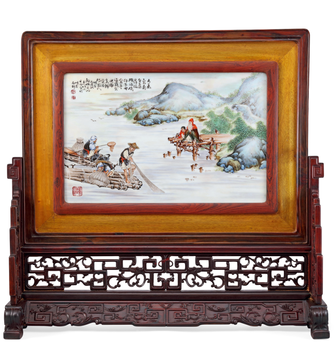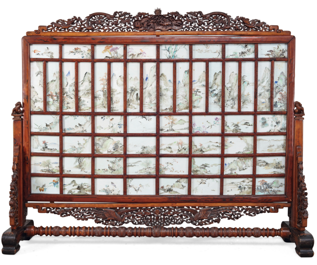 程门 浅绛彩山水花鸟瓷板屏风