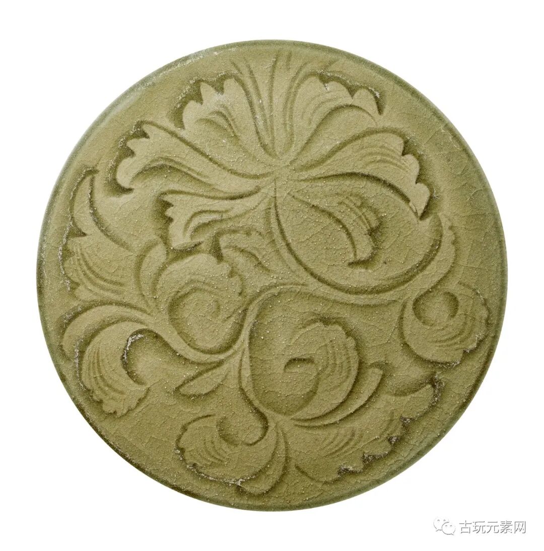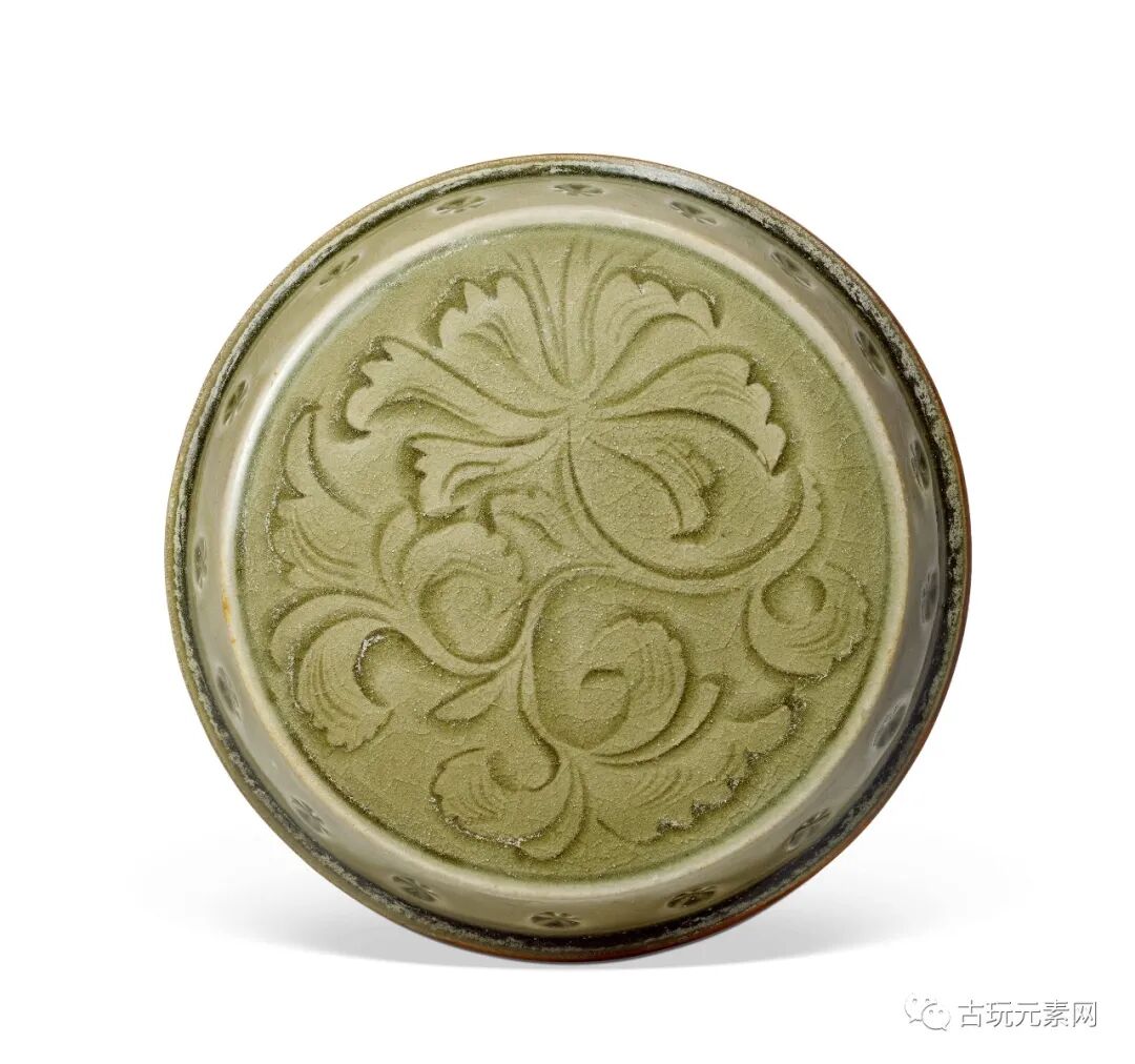 耀州窑青釉刻划牡丹纹鼓式盖盒