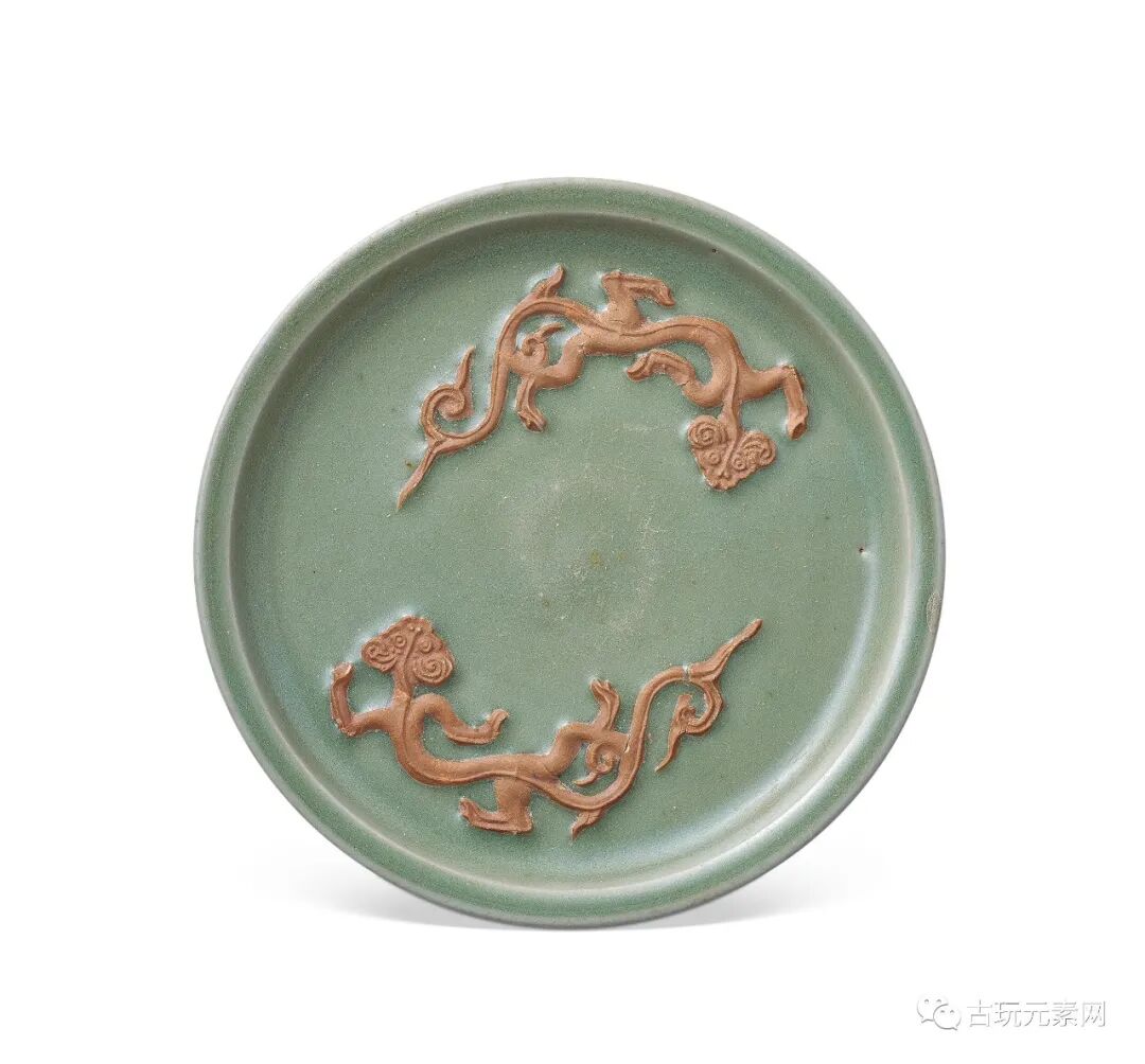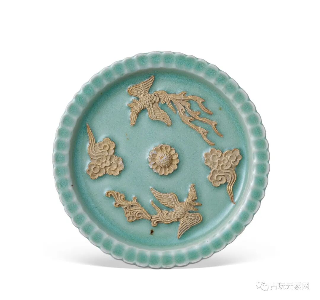 龙泉窑青釉露胎贴塑云凤纹菊瓣盘