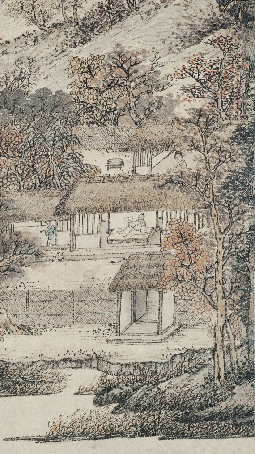 王蒙作为元四家之一,其作品量丰富,画风影响深远。他的《秋山草堂图》是一幅描绘江南山水风光的作品。与《青卞隐居图》的磅礴略有不同, 《秋山草堂图》虽未标明创作年代,却体现出王蒙早期明净的画风。画面从近景丛生的树木过渡到中景村舍,再由中景群峰推至远景群山,再现了郭熙笔下“平远、深远”的意境。此时,由于远山远水的淡雅笔墨,使得画面开阔广袤,一望无尽,与黄公望提出的“阔远”气势较为类似,且颇有元代赵孟頫古厚的风范。