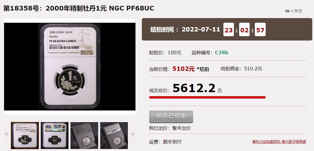 例如,这枚同为精制顶级高分NGC68分的牡丹1元硬币,成交价为5612.2元。