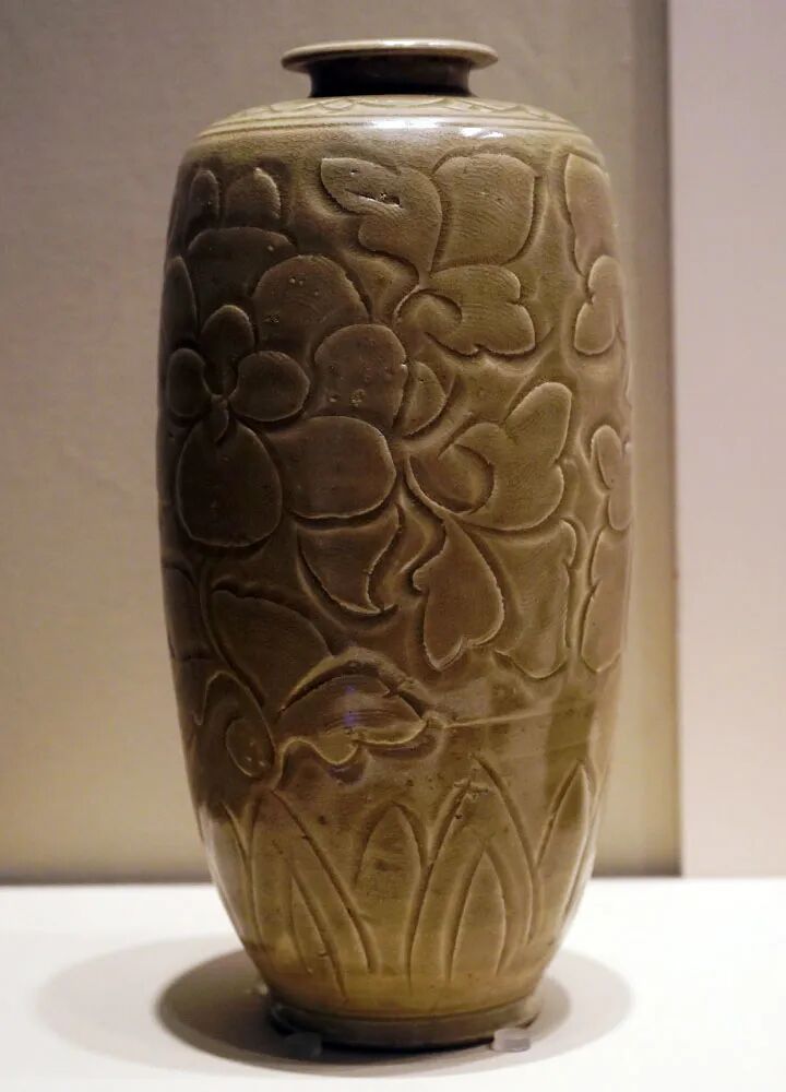 耀州窑青釉刻花牡丹纹梅瓶,花瓣上的细纹明显可见。(“空明流光”展品)