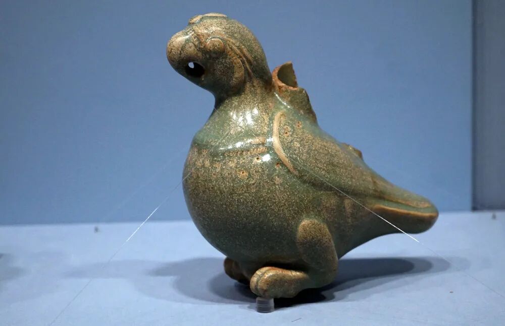 故宫博物院藏汝窑天青釉鹦鹉形香炉盖钮。跟现代人的欣赏趣味不同,这一件是汝窑中极少见的动物造型瓷器,物以稀为贵本应极受追捧,但历代以来受关注度远不及其它汝窑瓷器,造型特异于其艺术价值可能不增反减。(“空明流光”展品)
