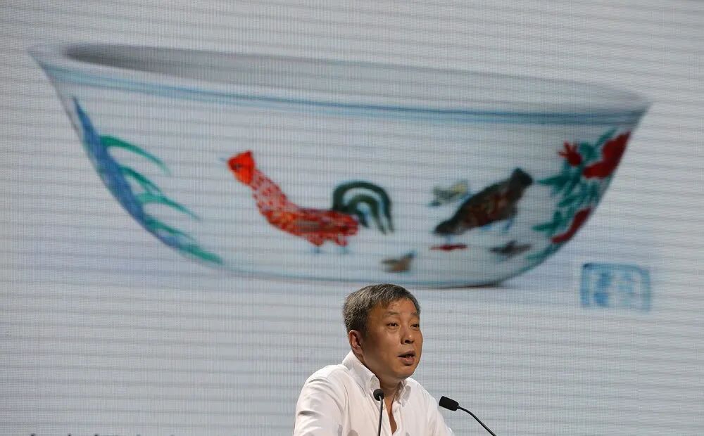 2014年4月27日,刘益谦在成都讲述他花2.8亿港币拍下的斗彩鸡缸杯。(王勤 摄)