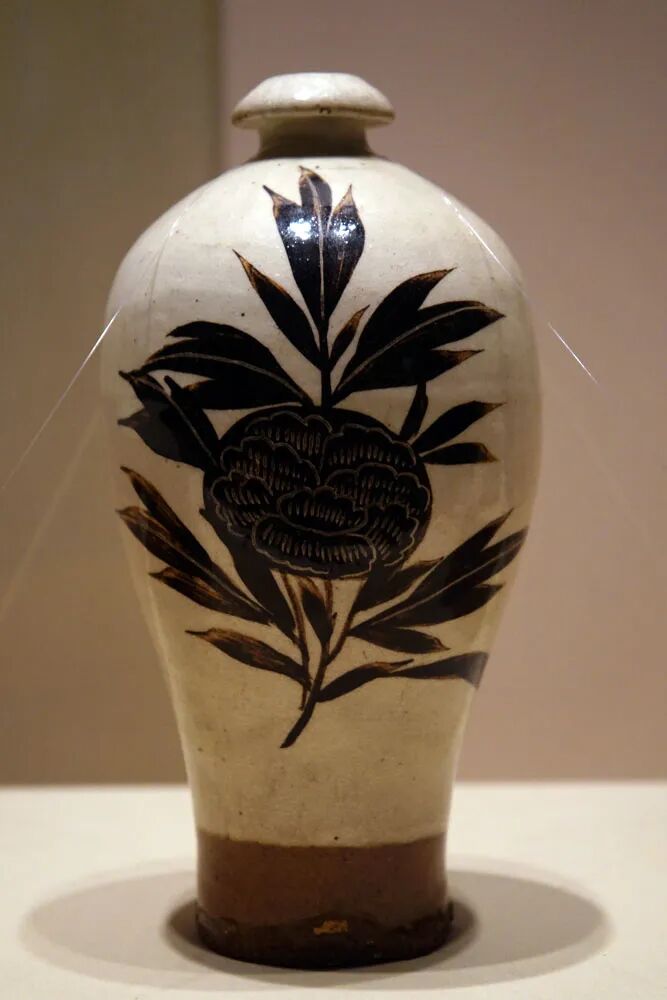 磁州窑白地黑花梅瓶。白底黑花是磁州窑的典型特色。(“空明流光”展品)