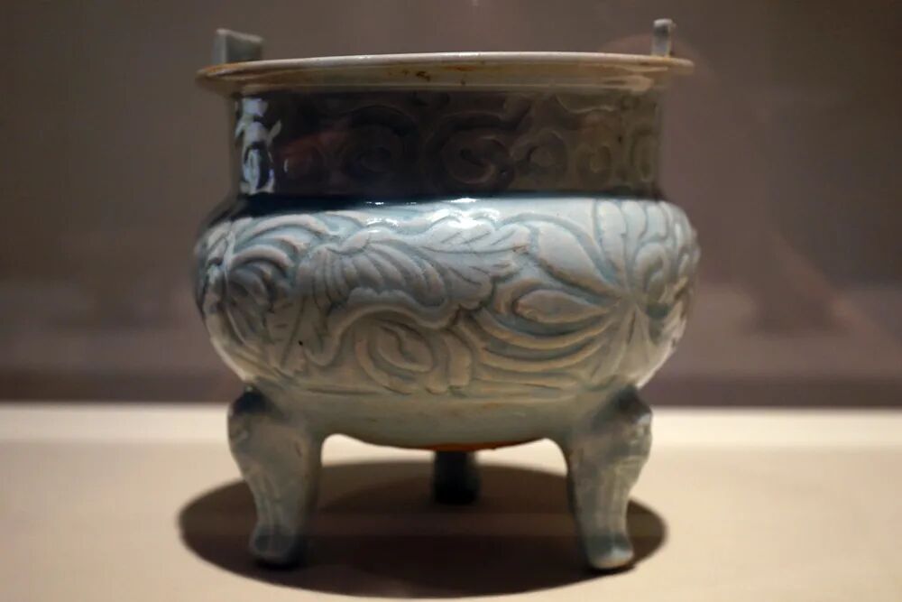 景德镇窑青白釉剔刻折枝荷叶莲花纹鼎式炉。(“空明流光”展品)
