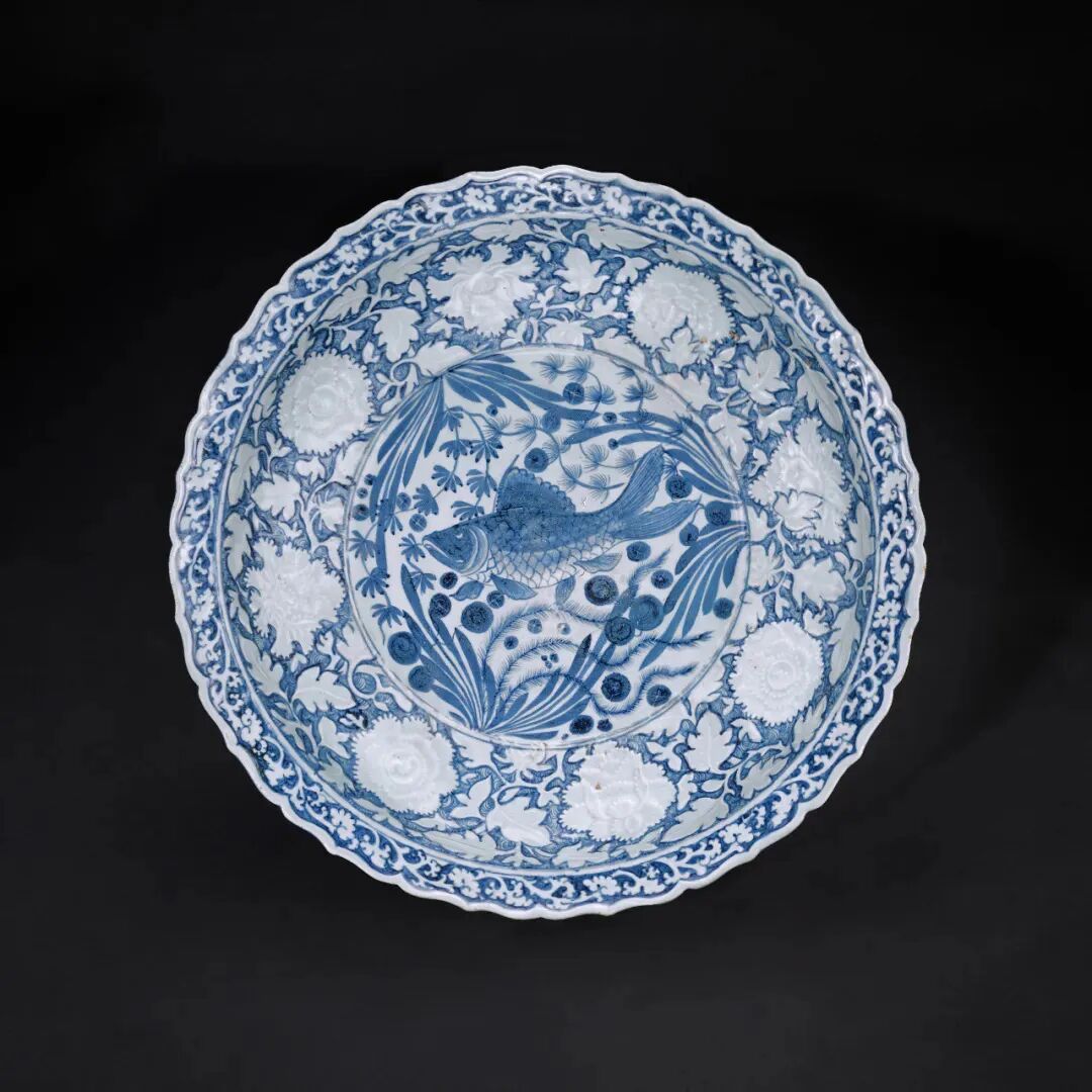 何鸿卿爵士私人珍藏专场,另有一元青花鱼藻凸花牡丹菱口大盘,器心画鲤鱼灵动如生,伴饰至少六种不同的水藻纹,随著游鱼摆荡。水面上浮萍两种,圆叶状者细枝相连,四瓣者如酢酱草般点缀,水中长厚叶为鳗草,纤长澎毛者金鱼藻,长枝节缀细毛藻者属轮藻,还有小叶丛生的狸藻。其中有数种与上述罐上所见亦同。