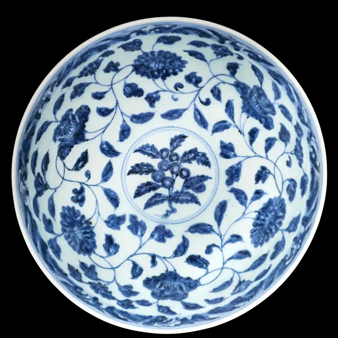 今秋续献刘銮雄珍藏御瓷,以永乐青花缠枝莲纹梅瓶领衔。因宫廷督造,永乐梅瓶集前朝之大成,丰唇宽肩下渐敛,器形雅致悦目、一丝不苟,观之赏心悦目,陈之平稳妥当。钴青代墨妙绘莲,运笔修饰花叶微末之处,缠枝牵绕花蓬,疏密错落,飘曳蜿蜒,当属明初典范。笔触所及多见钴蓝细点,称“铁锈斑”,乃早期青花画片特色,被后世奉为上乘青花独有之美。