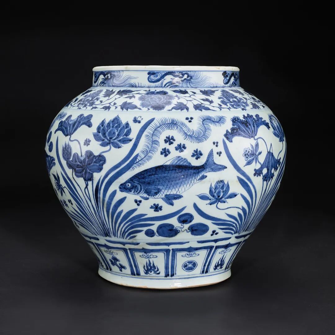 何鸿卿爵士旧藏元代青花鱼藻纹大罐,鱼纹成双,彼此相对,傲游莲池间,四鱼品种应为鲫、鲢、鲤、鳜,有吉利富贵之意。