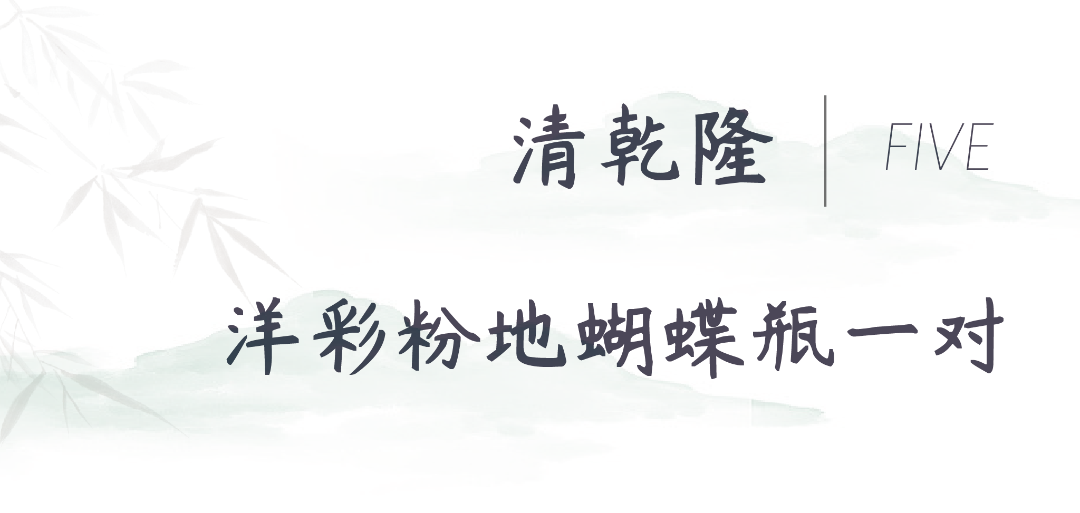 出自艾弗瑞·莫里森宝蓄的清乾隆洋彩粉地蝴蝶瓶一对,纹饰秀丽,施明艳粉地,带西方风格,绘蝶舞花间,缤纷绚烂,烧制一丝不苟,美不胜收。