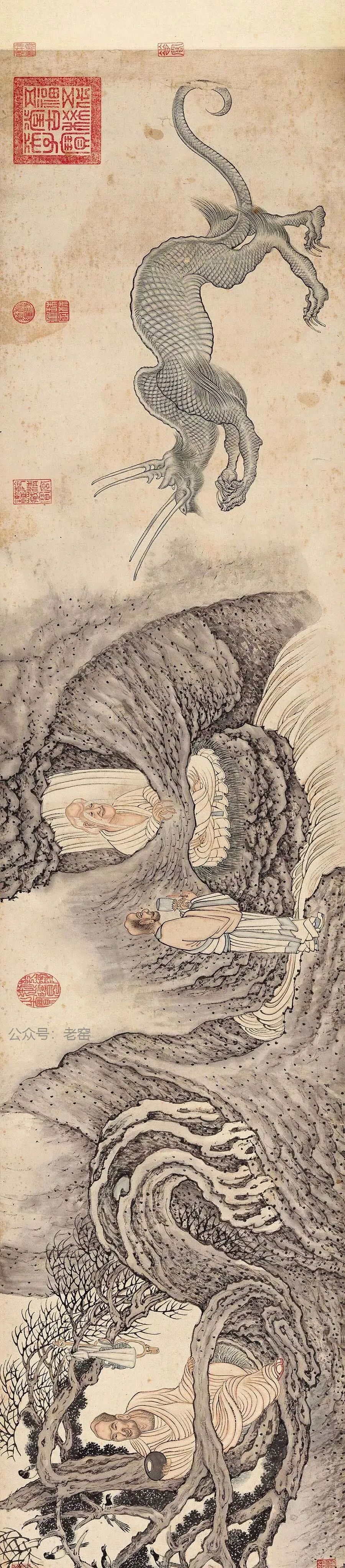 题跋:乾隆(1711-1799):贯休十八应真图,文中斯别开生面。形状奇怪夙所称,耳熟闻之目新见。苍鳞若龙若非龙,擎爪来闻法以现。第一。据树坐椸钵多罗,鸦鹊来餐香积饭。第二。飘然白鹤驾以降,屈眴七条披已惯。第三。数珠在手。第四。把明珠。第五。自摇箑其貌颟顸。第六。端立左铃而右杵。第七。扶童者迵顾彼崖。第八。是皆渡海履水物。水物狰狞名不辨。拍持具叶。第九。促舍汉。第十。白泽曳轮坐以晏。别有袖手乘骞槎。第十一。相参法喜作佳伴。据石入定若无人。第十二。牛哀跪伏如猫豢,傍见共谘二大士,其一默坐。第十三。一持扇。第十四。似步而迥更迥,第十五。臃肿披缁目光炫。第十六。跏趺相对谈二禅。云空。第十七。云色。第十八。色空幻,是为不二法之宗。绣居士说法编,向曾韵统考同文。位号次第订梵汉。莆田愚者不羁士。传神何碍后前舛。长歌笑我尚拘墟。山阴讶似镜中按。乾隆乙巳(1785)仲秋,御题。