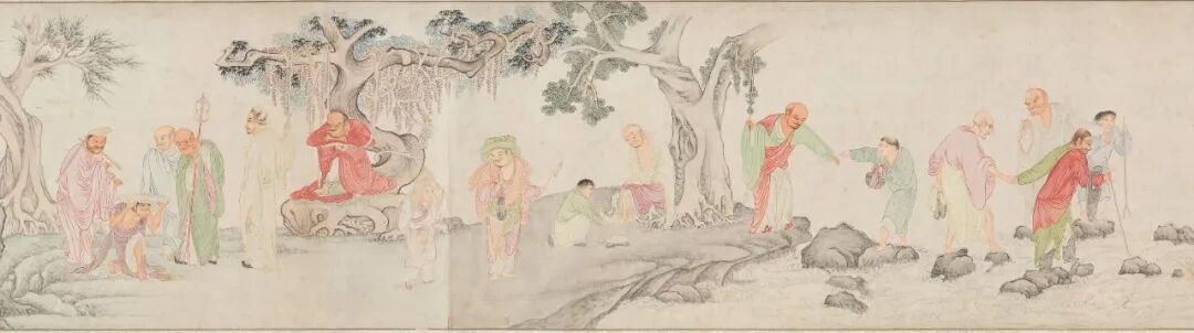 吴彬笔下的山水作品气势撼人,被学界誉为“不逊于宋代巨匠”。对于吴彬的研究,海外学界的重视程度远甚于国内。在西方,学者们对晚明绘画进行整理研究时,吴彬绘画中所表现出的特异图式自然地凸显出来。吴彬没有步文人画摹古的后尘,而是直抒心性。他的画风在当时颇具有前卫性,无论山水还是人物,都以极富个性的造型,以有别于传统的方式进行阐释。此卷《十八应真图》中的罗汉造型与吴彬其它传世作品,如《五百罗汉图》(今藏美国克利弗兰博物馆)、《十六应真图》(今藏美国纽约大都会艺术博物馆)和《画愣严二十五圆通册》(今藏台北故宫博物院)有着一致性,可谓“貌甚奇古”。