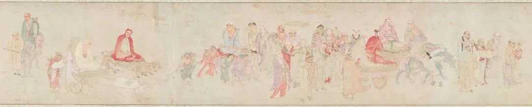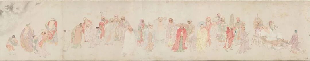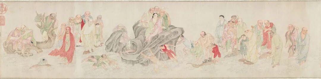 吴彬绘制的《五百罗汉》展现给人们的是一个个奇特怪异,不同流俗的人物形象。作者不惜力气,着意刻画人物动态和内心世界的同时,对于背景的描写却采用了以少胜多、以虚衬实的手法,几乎舍掉了众多人物存在的自然环境,使一个个形态各异的人物更加鲜艳夺目。