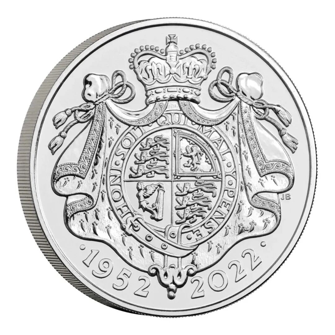 纪念币的背面图案,一枚是印有”70“的字样,来代表伊丽莎白二世在位的年数。其中数字“0”的内部印有日期和皇冠,来代表其身份的象征。