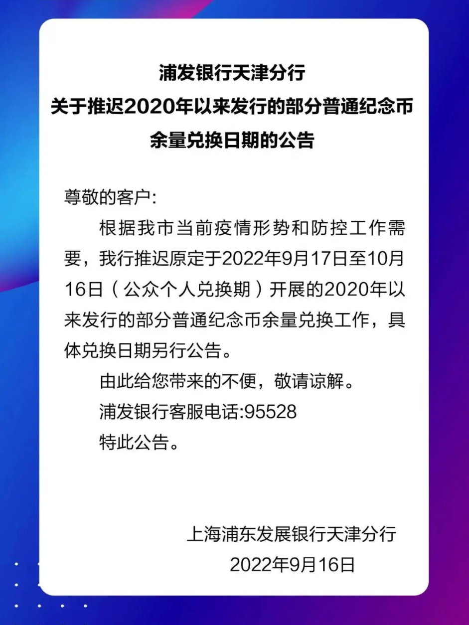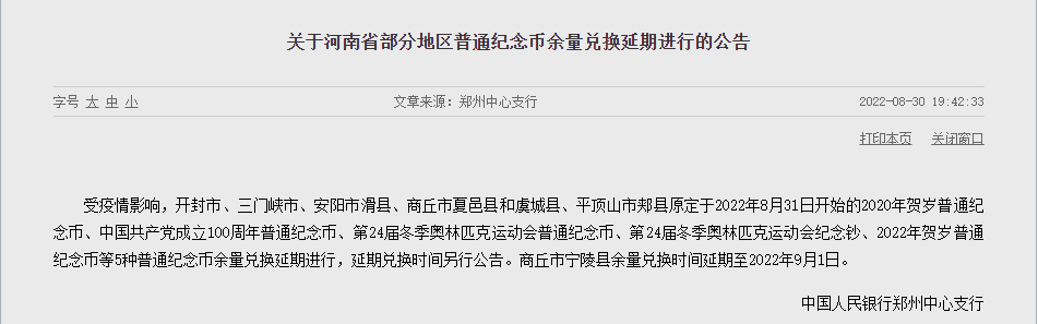 受疫情影响,开封市、三门峡市、滑县、商丘市夏邑县和虞城县、郏县原定于2022年8月31日开始的5种普通纪念币余量兑换延期进行,延期兑换时间另行公告。