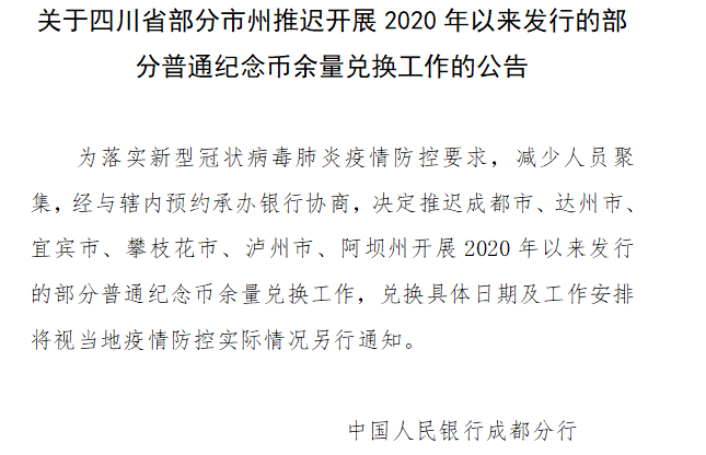 根据公告,这次会推迟成都市、达州市、宜宾市、攀枝花市、泸州市、阿坝州地区的纪念币兑换工作。