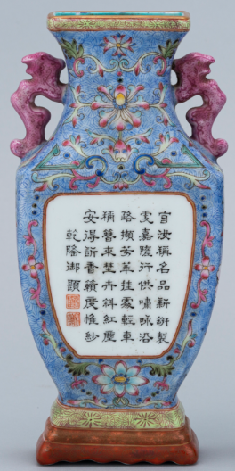 到了清代,书坛涌现了如郑簠、金农、伊秉绶等一大批擅长隶书的书法家。隶书由于结构工整、风格庄重的特点,也十分适合作为装饰。例如馆藏的粉彩开光双龙耳壁瓶的中央,就有一首隶书的乾隆御题诗。诗文如下: