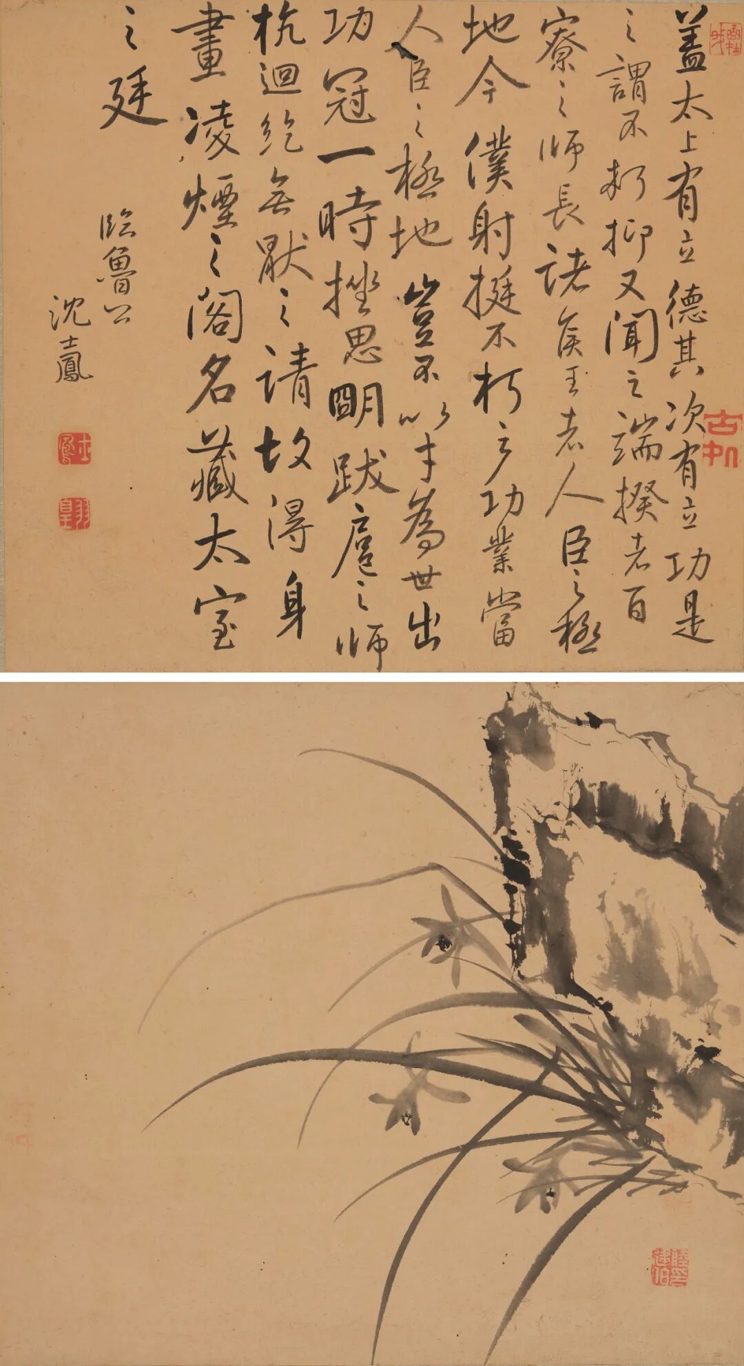 本期中国古代书画网拍,我们为您精心准备了近140件古代书画作品,分为“卧游”和“骋怀”两个专场呈现,形制从立轴、镜心到扇面、对联等等,题材丰富,不乏佳构逸品。闲暇之时,摒除一切杂念,铺展画卷,独自欣赏。画上所描绘的幽远意境,使人仿佛置身于寂静的山林之中。峰岫耸峙,云林繁密深远,大自然的千万种旨趣融合,陶冶情操,并引人无限遐思,此乃“卧游”之义也。本期“卧游——中国古代书画网拍专场(八)”共有七十件作品,“卧游”其中,相信定能为您带来愉悦的精神享受。本场带来两组同一藏家专题,他们均收藏书画有年,爱之甚也。藏品中书法风格流丽蕴藉,山水意境清远高逸,表现出当时文士怡然自得的生活趣味。说明:同一藏家旧藏。沈士凤(清)、陆建伯(清) 节临颜真卿争座位帖、兰石图