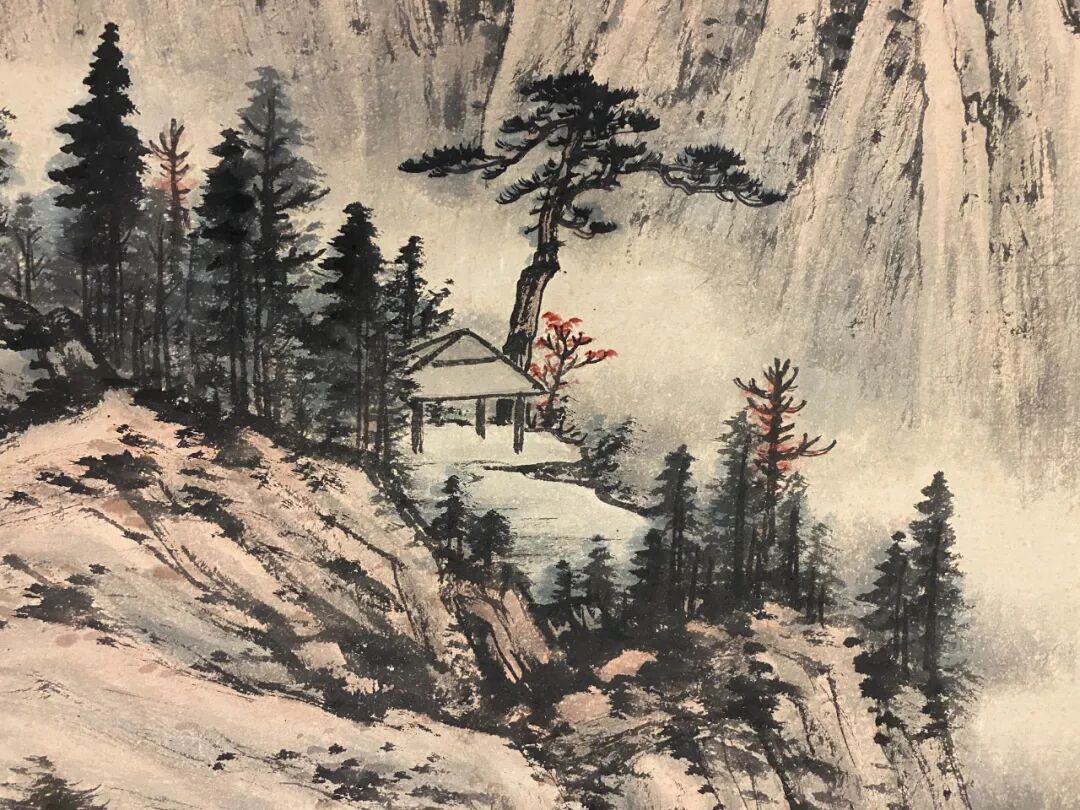 胡刘二人先后主理金门防务,戎旅生涯亦于此时交集尤多。一九五八年八月廿三日,金门烽烟再起,胡琏掌防卫司令部,遭炮火所伤,复眼疾恶化,刘安祺遂临危受命接任,巩固防务。本幅写于一九六五年,刘氏已掌陆军,胡琏时驻节越南,遂倩黄君璧精绘六呎整纸山水遥寄。两人戎马一生,借山水清音抒志,豪情壮怀,惟寄纸中。