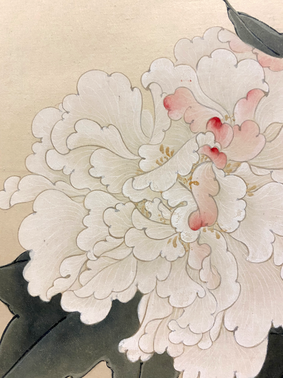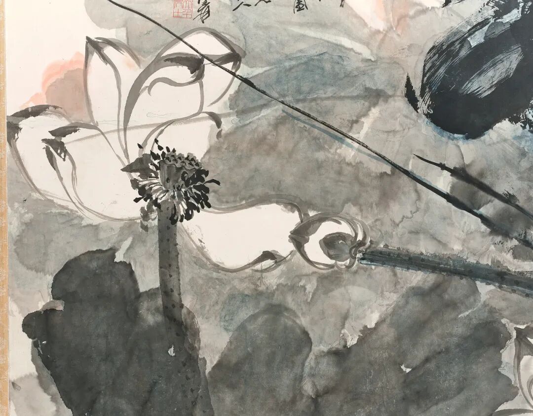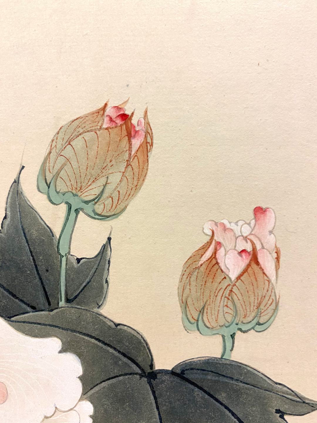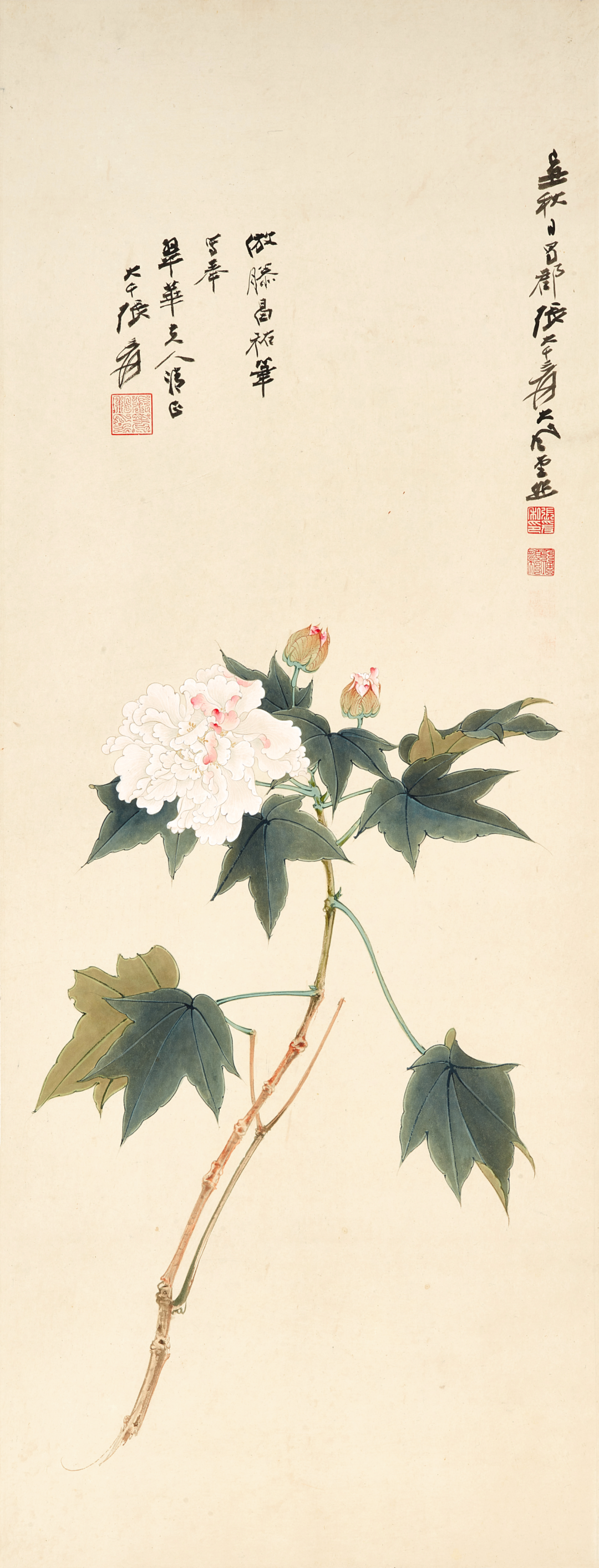 芙蓉,多生蜀地,绽于秋日,凌霜自放,又名拒霜,历代文人好咏之。本幅作折枝芙蓉,勾染俱精细,写花头尤见功力深厚,线条宛转灵动,花瓣渐层敷以白粉,呈现微妙质感变化。花瓣皆勾筋络,一丝不苟,几片淡抹胭脂,娇艳欲滴之态顿生,似美人迎风初醉,楚楚动人。两只花苞聚首,饱满待放,一朵幼瓣已露头,似正挣脱束缚,欲吐芬芳,令人如临实境,睹其风华。本幅题仿滕昌佑。滕氏乃五代画家,唐末避黄巢乱入蜀,画史载其莳花写生,尤爱芙蓉,启宋代院体花鸟风尚,其画迹少传,大千上世纪三、四十年代时拟其笔,或无真本依托,取其精神,抒己胸臆耳!