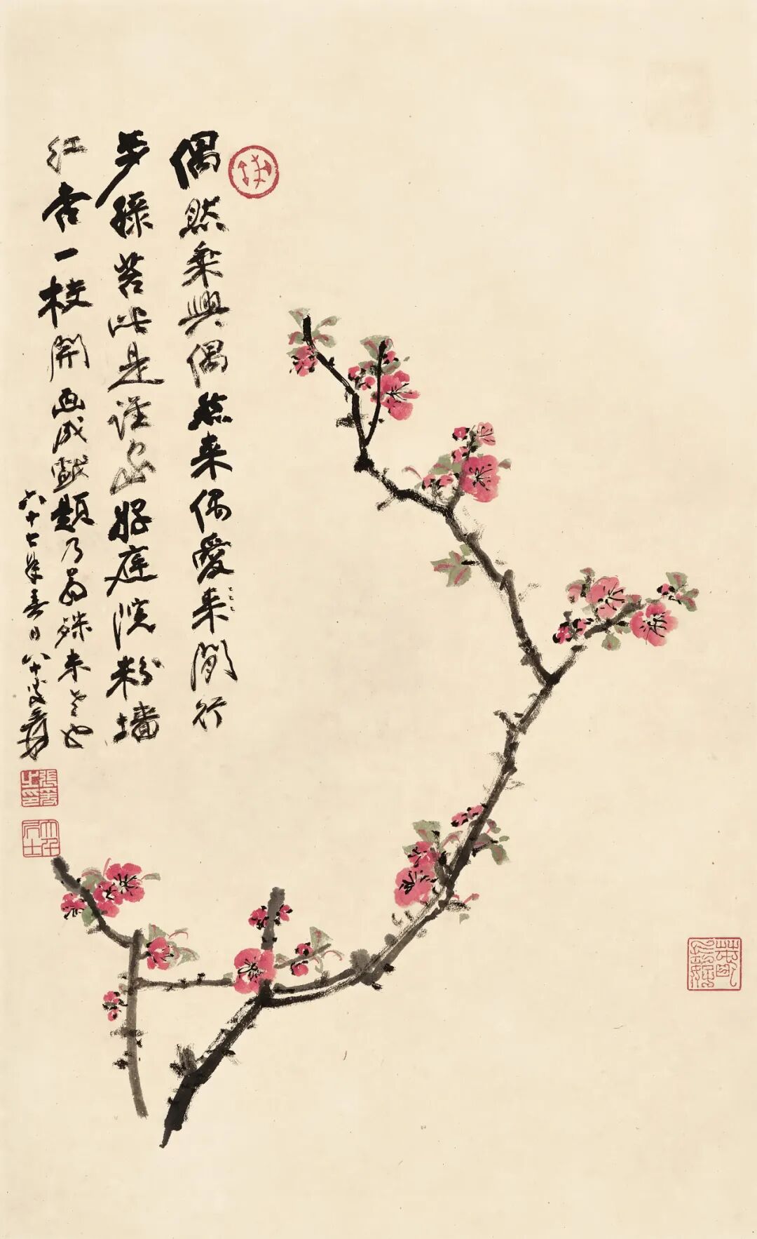 偶然乘兴偶然来,偶爱闲行步绿苔;此是谁家好庭院,粉墙红杏一枝开。画成戏题,乃翁殊未老也。六十七年春日。八十叟爰。