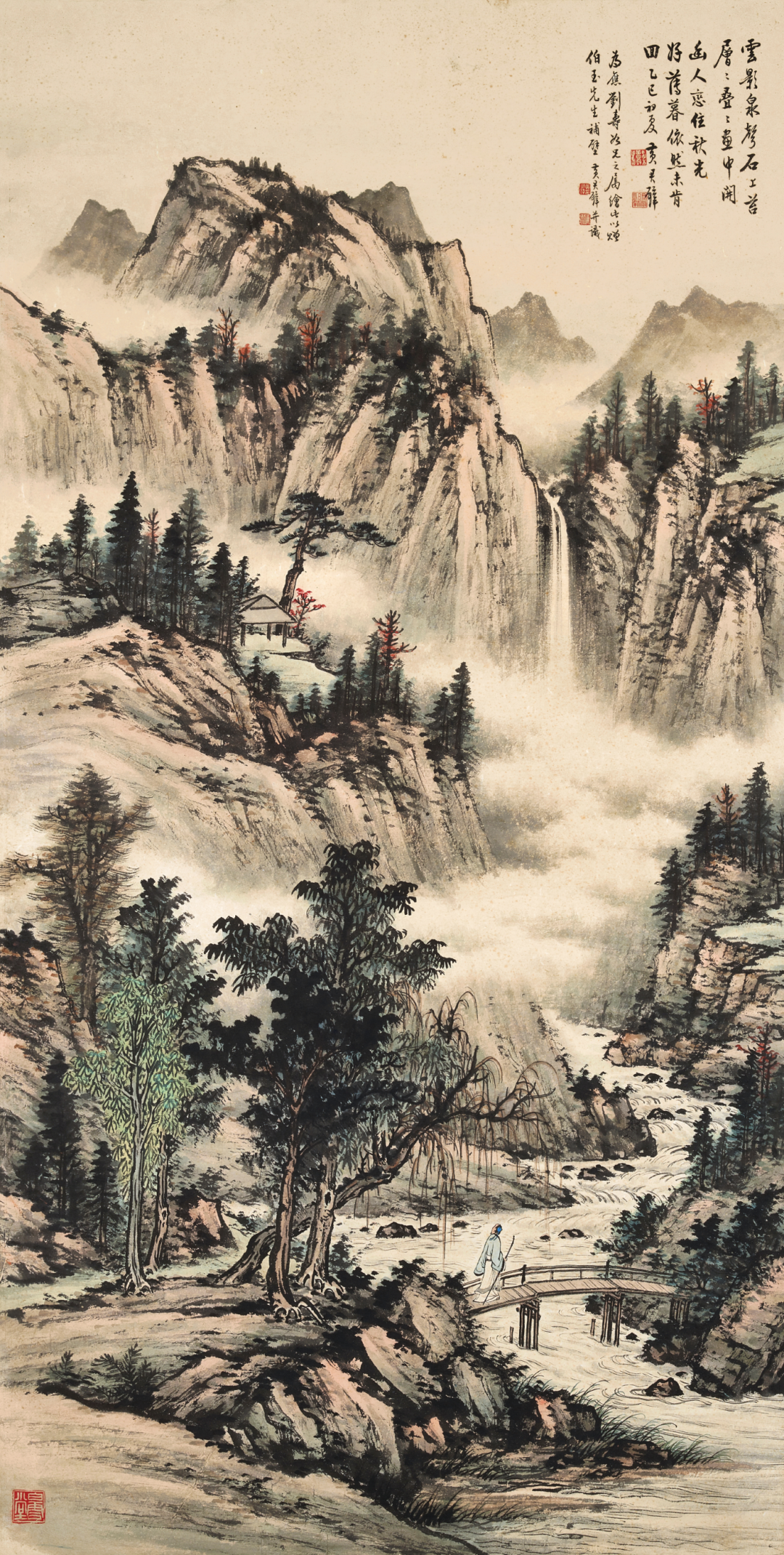 云影泉声石上苔,层层叠叠画中开;幽人恋住秋光好,薄暮依照未肯回。乙巳初夏。黄君璧。