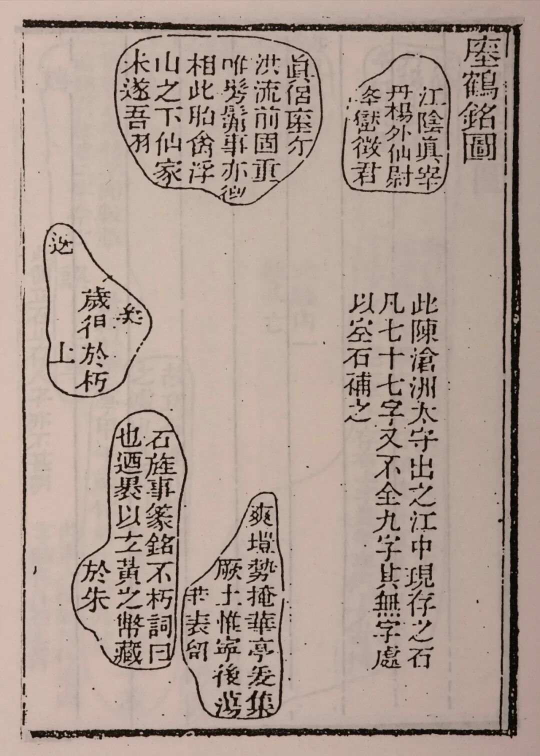 潘宁题跋 张弨《瘗鹤铭》原图 《瘗鹤铭》出水本图 更有意思的是,前引文献都谓这块残石“三十字”,而潘本与出水本都是29字,缺失者为第三行末“浮丘”的“丘”字。康熙六年(1667)张弨(力臣)亲自到焦山探访,撰成《〈瘗鹤铭〉辨》一卷,书前有《瘗鹤铭》图,标记所见字迹,第三石为30字,“丘”字完好。