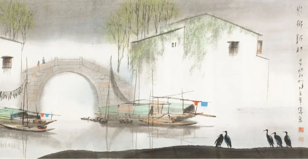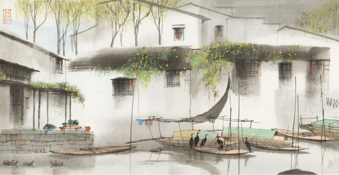 杨明义的作品以“水墨水乡”而闻名。他的早期版画有水墨味,他的当代水墨画则呈现了传统中国水墨画和现代水印木刻版画的交融,造型是现代的,笔墨化自中国传统文人画。早期版画中呈现的水乡,初享发现水乡之乐,从苏州水泽蔓延开去,又漂洋过海,借改革开放之新风。在北美和当代艺术纠缠盘桓了多年,他画的还是水乡,那是隔着大洋的回望中的水乡,沉浸着游子的祖国之思和画家的艺术自我变革的当代心动。杨明义又游走欧陆和东瀛,缘水而画水,心帆荡漾其中,得其意而忘其形。