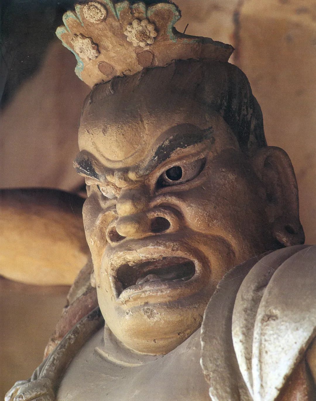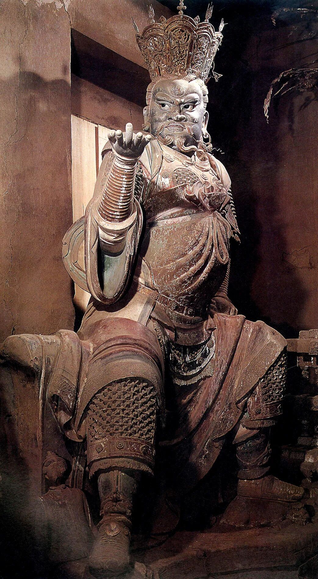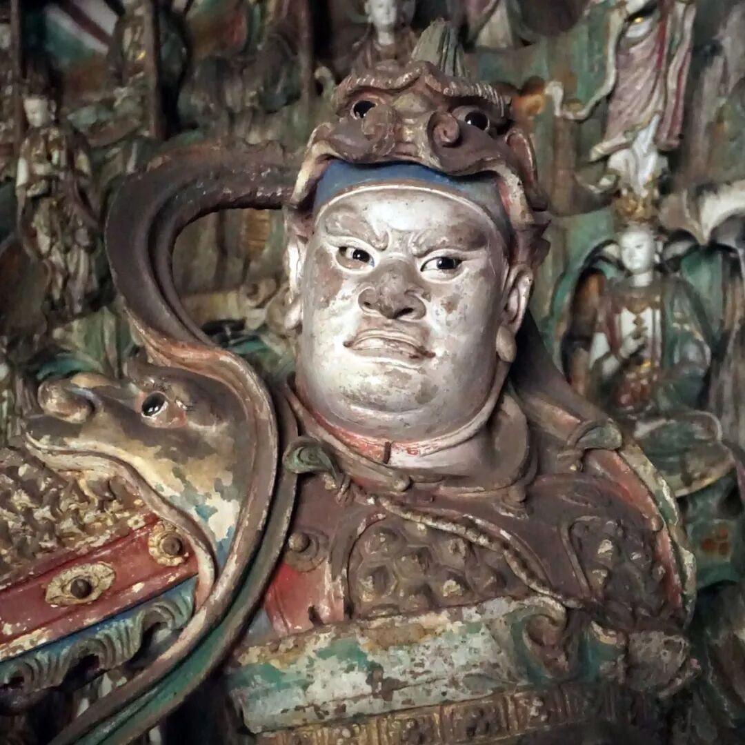 千佛殿的韦驮像,在全国同类彩塑题材作品中,这尊塑像可谓之精品,备受海内外识者交口称誉,说他刚中有柔,武中蕴文,威而不悍,机智勇猛,浑身是力,身如强弓等等。概括之约有三点:双重性格的深入刻画;夸张变形身躯表现力度;面部表情高度传神。这些因素相辅相成,共同构成韦驮像的艺术特色,使这个人物具有性格特征而活了起来。此外,还有一项重要因素应强调指出,即韦驮静态典型中所表现出的运动——不动之动,这也是韦驮像之所以取得生动气韵,达到传神效果,在艺术上获得巨大成功的重要原因。由于是寺庙中的圆雕,观赏的最佳视点被巧妙地安排于一进殿门的位置,这既是由于当时宗教活动的形式所限,以符合人们的观赏习惯。从此视点看韦驮像的构图,其身体重心基于左足,下肢朝前站立,从腰部开始,由头部带动整个上体躯干向右侧扭曲,这种扭曲程度,已极大地超出了人体生理所允许的限度,很像—节麻花,但人们从整体气势观看,这种违反人体解剖结构的姿态,不仅没有一点不舒服的感觉,相反却从这种艺术夸张变形之中,感到一种强大的力度和动势,这是由一条从头到脚贯穿于韦驮全身的S形曲线所表现出来的,这条曲线极富弹力和流动感,构成了韦驮身体动态的主轴线,加之韦驮身上的飘带萦绕飞舞,本身就是大的曲线,从视觉上也加强了动势。韦驮右臂握拳下垂,肘部向外部伸出,让人感觉肌肉紧张,充满力量。左臂抬起,同右臂形成对比(手部已残,原来似握金刚杵)。韦驮整个身躯外轮廓构成一个略带倾斜的三角形,这个三角形由左手、右手肘部和足部三个突出点形成。由于这个锐角三角形的顶点在下部并呈倾斜状态,给人心理上造成了一种微妙的不平衡和不稳定感,因而也增加了这尊塑像的活力和行动感觉。