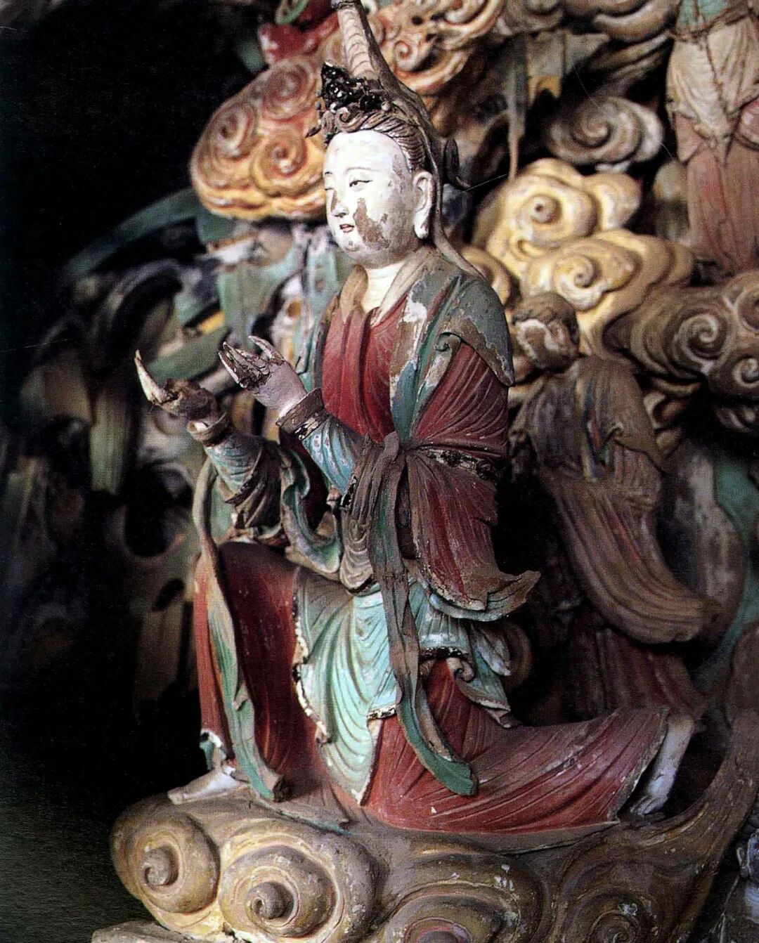 供养人像主像雕塑构思精妙,各殿四壁的悬塑故事,让心思在神话故事中自由徜徉。这些悬塑运用圆雕和深、浅浮雕的手法分层组合,人物身份不同,神态也各异。释迦殿内,古代艺术家将佛教创始人释迦牟尼从投胎降生、涅盘成佛到四方传经、普度众生的故事生动再现出来;武圣殿内,有关羽的“桃园结义”、“怒斩华雄”、“斩蔡阳”、“水淹七军”等故事;阎罗殿内,有按佛经中“六道轮回”、“三世因果”的说法构思的雕塑,每个人物虽高仅几十厘米,却生动传神。在千佛殿,殿内窗台和门两侧有30多尊生动逼真的人物雕塑像。