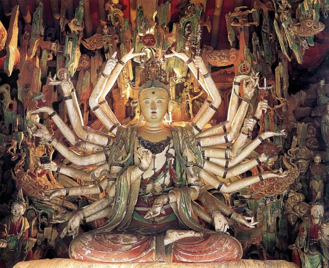 菩萨殿在中院西侧,正与千佛殿相对,面阔七间,25.28米,进深四椽,10.01米,主像为二十六臂观世音,结跏趺居中而坐,高3.45米。帝释、梵天皆1.78米,二十六臂观音应为准提观音。准提观音又名七俱胝佛母,又称准提菩萨,为六观音之一。其像有二臂、四臂、六臂、八臂、十臂、十二臂、十八臂、二十四臂、二十六臂、三十二臂等不同。此为二十六臂。《七俱胝佛母所说准提陀罗尼经》说:“应画准提佛母像,身黄白色,结跏趺坐其上。身佩圆光,着轻觳,如十波罗密菩萨衣,上下皆作白色。”又云:“其像面有三目,有十八臂,上二手作说法相。右第二手作施无畏,第三手执剑,第四手执宝鬘,第五手掌俱缘果,第六手执钺斧,第七手执钩,第八手执金刚杵;第九手执念珠;左第二手执如意宝幢;第三手持开敷红莲花,第四手军持,第五手绢索,第六手持轮,第七手商佉,第八手贤瓶,第九手掌般若梵夹。莲花下画水池,池中有难陀龙王,坞波难陀龙王托莲花座。上面二净居天。”观音仪容丰满端庄,神态温柔隽逸,手势富于变化。菩萨虽多手多臂但并不使人感到不自然,相反形象的端丽娴雅、雍容大度,却慈祥感人。四周悬塑四百多菩萨,或骑或兽,或踏祥云,衣裙飘动,翱翔天宇,云集而来。形象优美,色彩绚丽,生动地描绘了一个理想的菩萨殿堂。