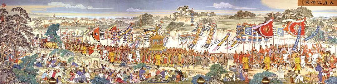 此图综合唐代历次迎奉佛骨舍利到长安宫中的沿途盛况,描绘上自朝廷、下至士庶万众瞻礼的宏大场面。