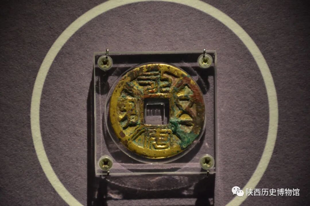 鎏金“永安五男”铜钱:唐代,圆形方孔,面与背均铸四出纹,正面钱文“永安五男”,篆书、对读,背面按上下左右方位饰四神图案。北魏永安二年(529)所铸“永安五铢”,直径2.3厘米,重3克左右,但这枚鎏金“永安五男”铜钱,重量达20克,远超北魏“永安五铢”,钱文“安”字不借穿郭,正面“永安五男”四字吉语合用,背面有四神祥瑞图案与其呼应,这些特点均与北魏“永安五铢”不相符,因此应该是唐人铸造的压胜钱,具有辟邪护佑的祥瑞性质。有学者认为是唐玄宗为祝福他们兄弟五人的吉祥安康和友谊而特别铸造的“魇胜钱”,犹如护身符。